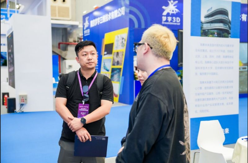 海赛未来售前工程师向客户介绍基于全国产自主可控AI引擎和几何引擎打造的墨智空间元宇宙情况,该产品目前已在智能建造、智能制造和城市数字化运营管理领域落地应用,帮助行业用户实现管理改善、成本降低、风险控制。