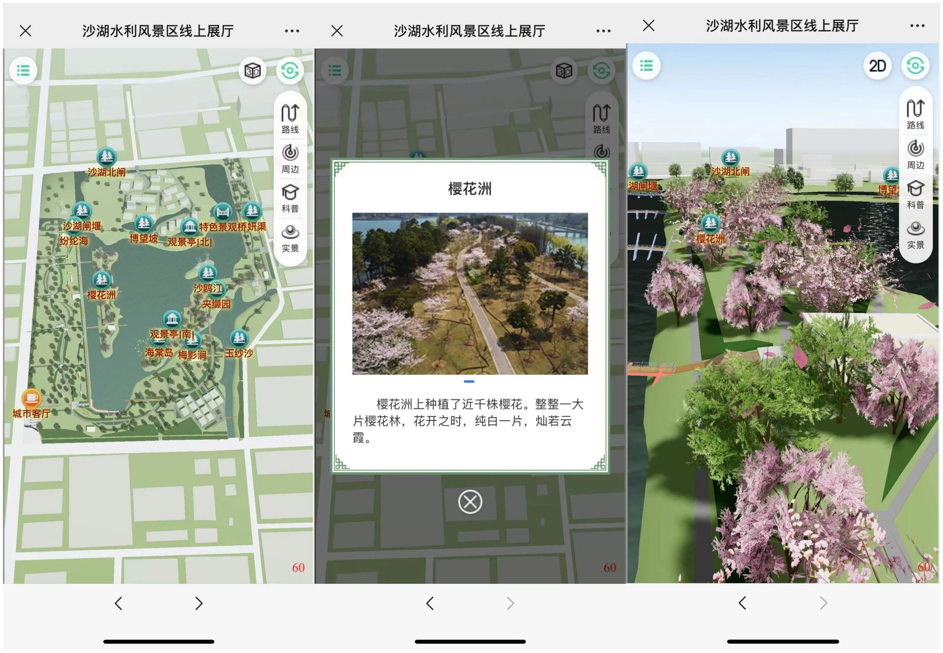今天的沙湖水利风景区内,各个景点处冒出了一个个二维码,游客通过手机扫描二维码打开小程序后,便可以沉浸式地步入到三维线上沙湖展厅空间内。沙湖虚拟展厅作为导览地图,将地理位置信息植入小程序中,游客通过与三维场景内各景点的交互,查看景点的图文视频介绍,全方位感受风景区的奥妙。点击景点如“樱花洲”,便能查看景点的图文、视频介绍。或者还可选择一种更直观的形式,将视角切换成3D模式,体验可视化的线上导览功能。再结合线上科普牌、科普馆等,通过线上线下融合的方式,更加直观、生动形象的了解沙湖背后的历史变迁和人文故事。