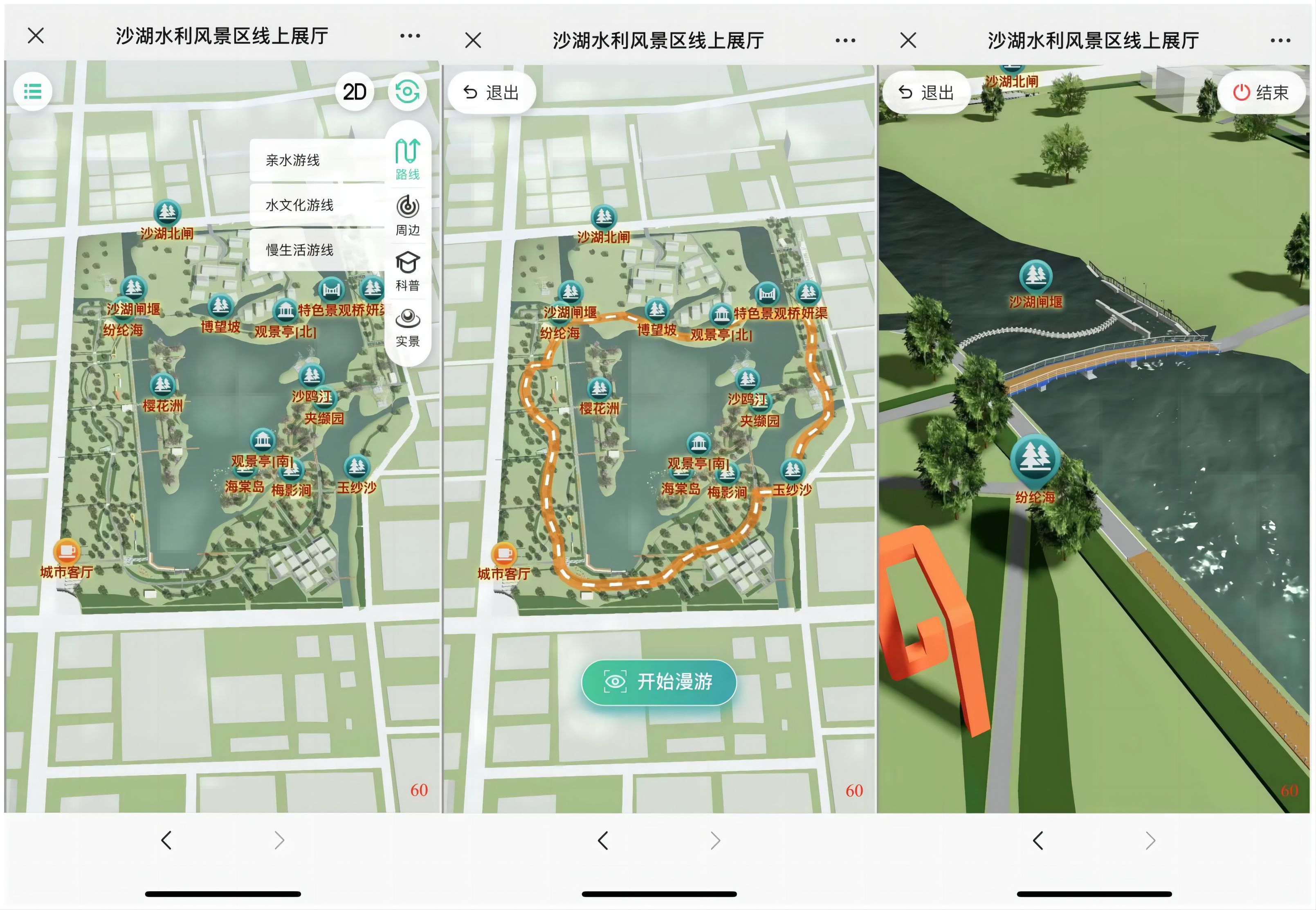 线上展厅还设计了3条推荐游线,包括亲水游线、水文化游线、慢生活游线,将路线在三维模型中进行可视化展示,供游客根据个人喜好进行选择,并在对应路线进行场景漫游。