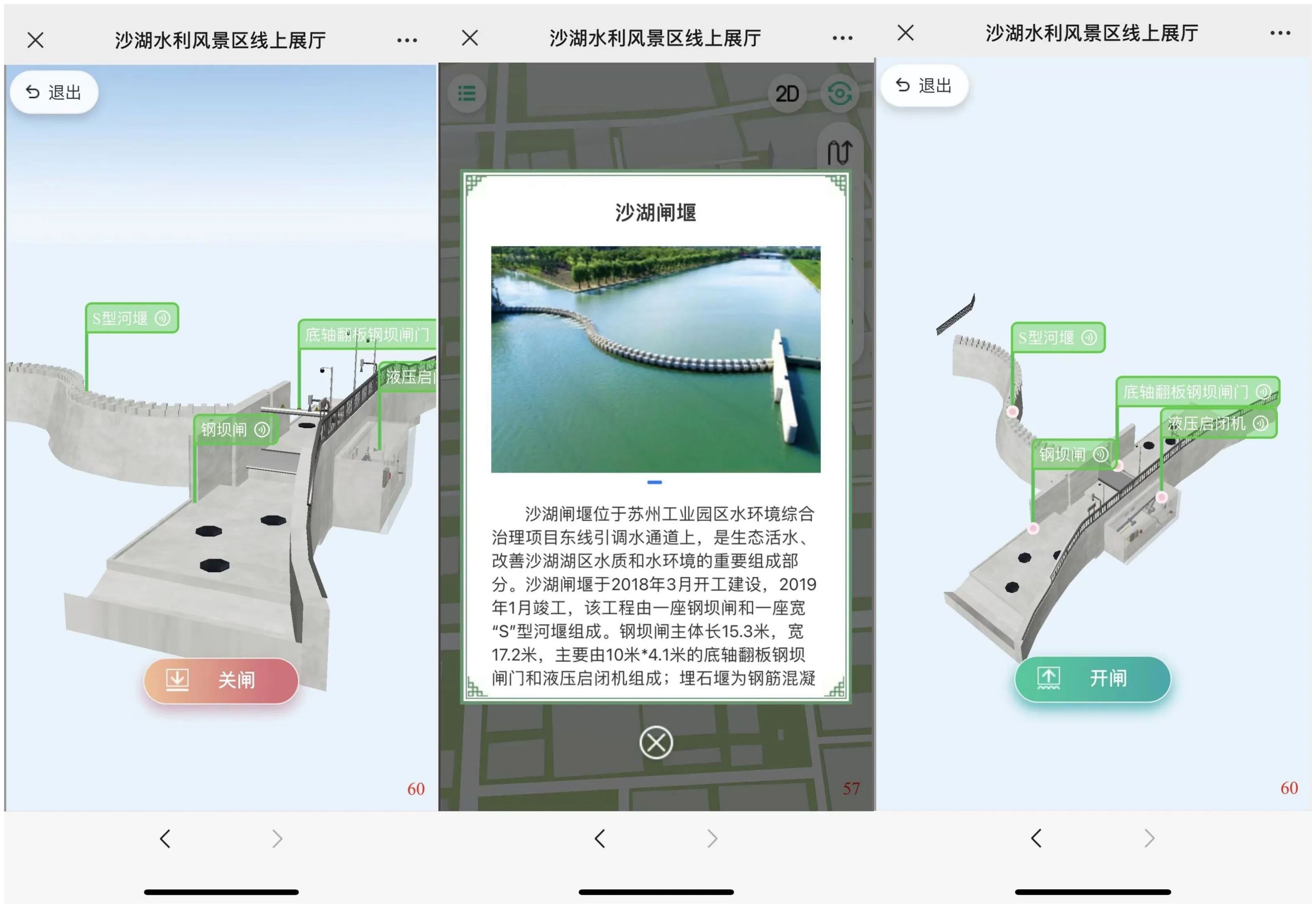 沙湖线上展厅针对“沙湖闸堰”这一水利工程定制了模型内景,只需切换至内景视角,便可观摩闸堰控制的三维结构,帮助游客深入了解沙湖水利工程的治理历史变迁和工作原理。